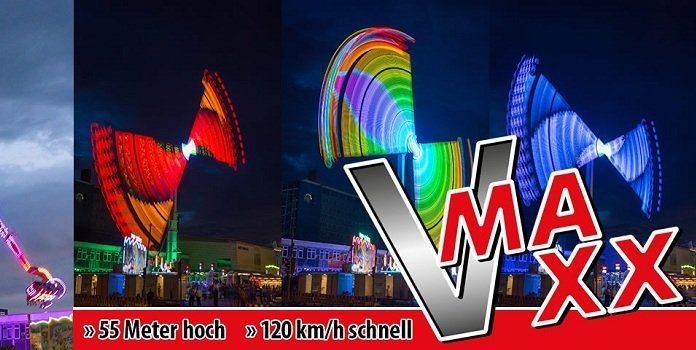 Der Standort auf dem Stoppelmarkt, lässt das Riesenrad klein Aussehen, denn der V-Maxx steht nur einige Meter vom Riesenrad entfernt, doch überbietet es mit der Höhe von 55 Meter um ganze 7 Meter. Damit ihr wisst was euch bei der Fahrt mit dem V-Maxx erwartet, haben wir euch ein Video bei Youtube rausgesucht.